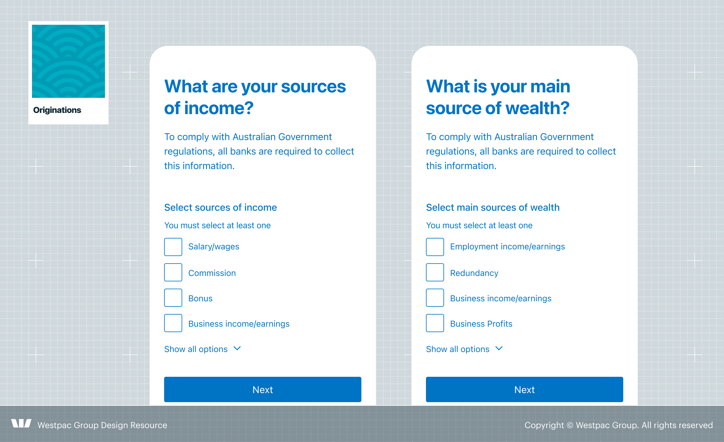 Use these patterns to gather income sources and wealth-building information from new or existing business and consumer customers. This is necessary to comply with anti-money laundering and counter-terrorism regulations.